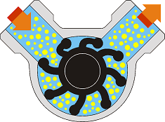 Pump principle - The flexible impeller vanes deform slightly to pump the liquid inside the pump and move it to the discharge port at a stedy flow rate. This principle combines gentle pumping with a high self-priming action.